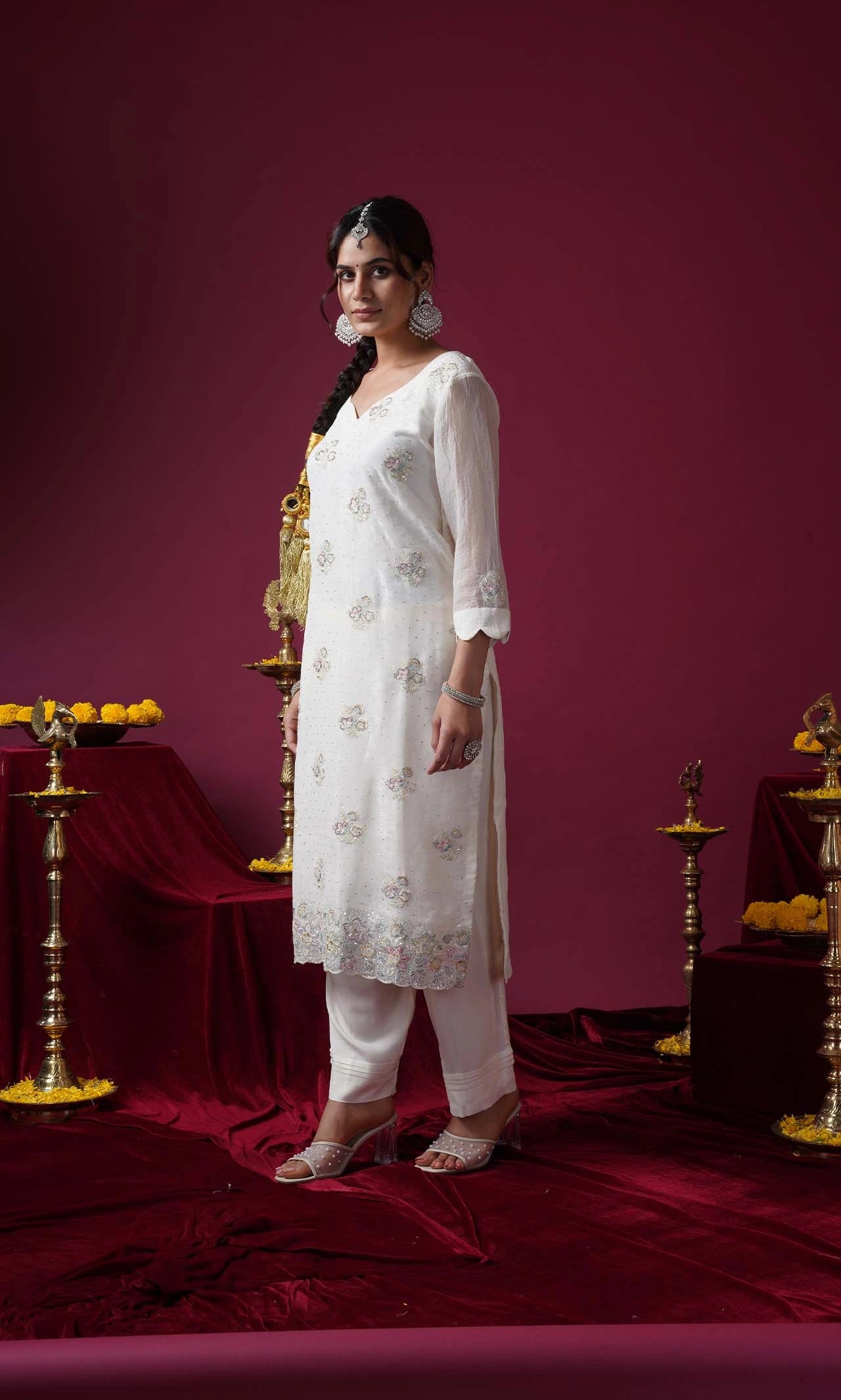 A classic white party wear suit set that balances minimalism with rich festive detailing. Style with silver jewelry, embellished heels, and a statement clutch for a complete evening-ready look.