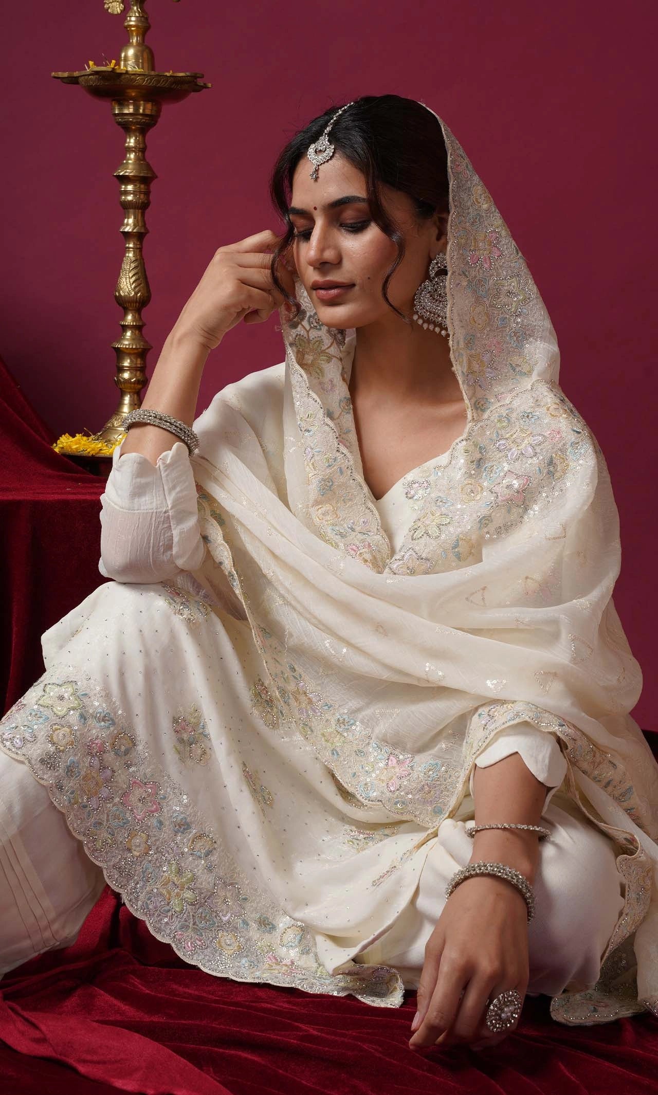 Lightweight dupatta in Crunchy Chiffon, elevated with ornate embroidered borders and embellished detailing, creating a flowy, festive finish.