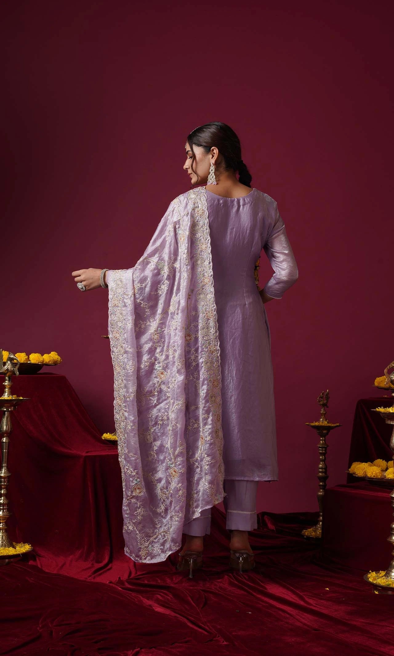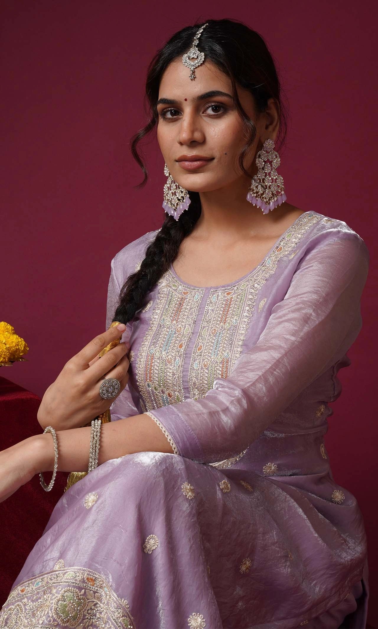 Step into luxury with this lavender zari embroidered suit set, thoughtfully designed for festive and wedding occasions. The kurta, crafted in premium Skylone fabric, showcases exquisite zari and thread embroidery accentuated with delicate sequins. A round neckline with lace detailing adds timeless charm.