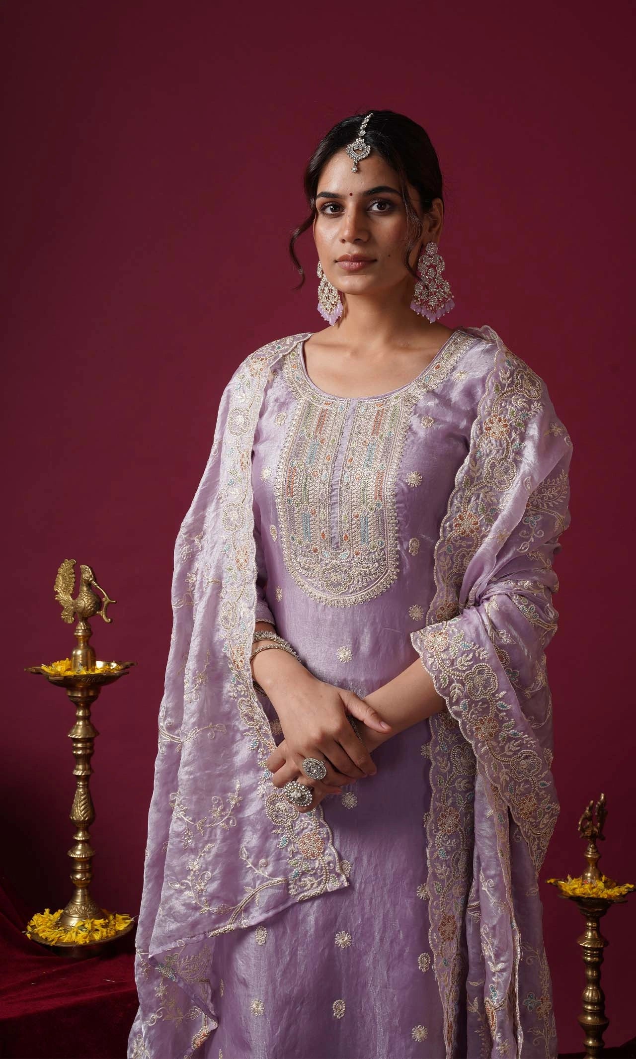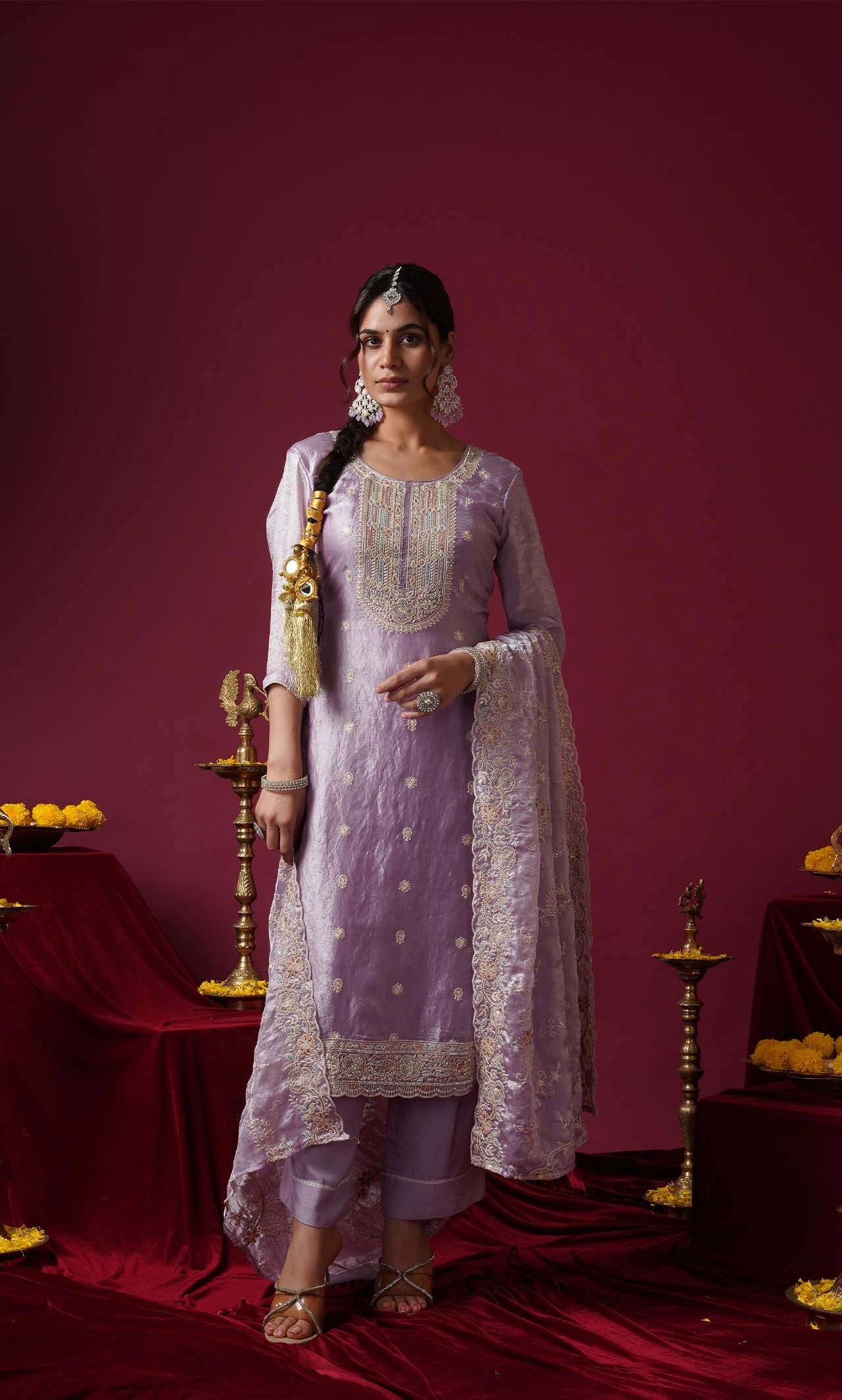An opulent lavender suit set that blends regal tradition with modern grace. Pair it with chandbalis, embellished sandals, and a statement clutch to create the perfect festive look.