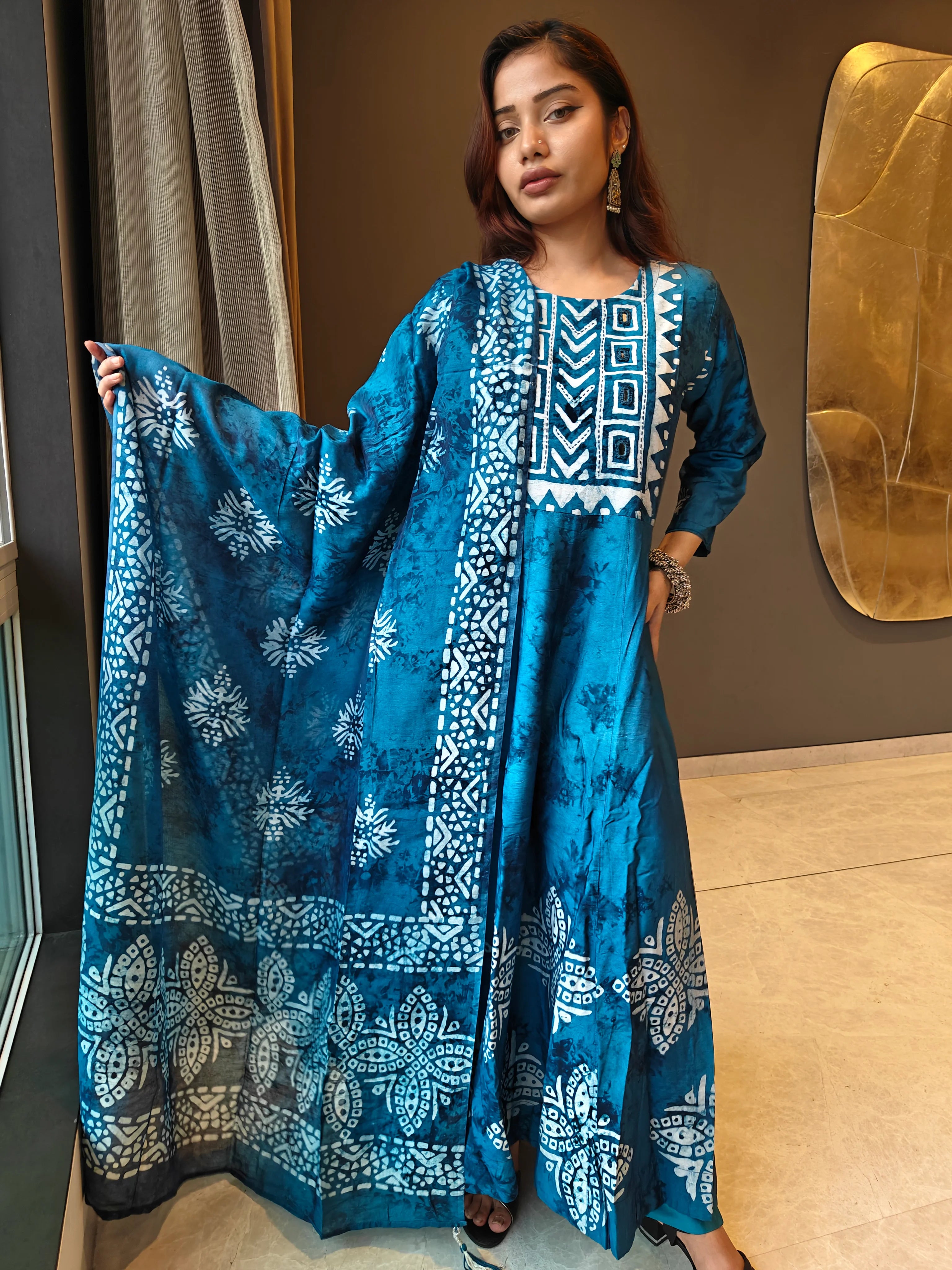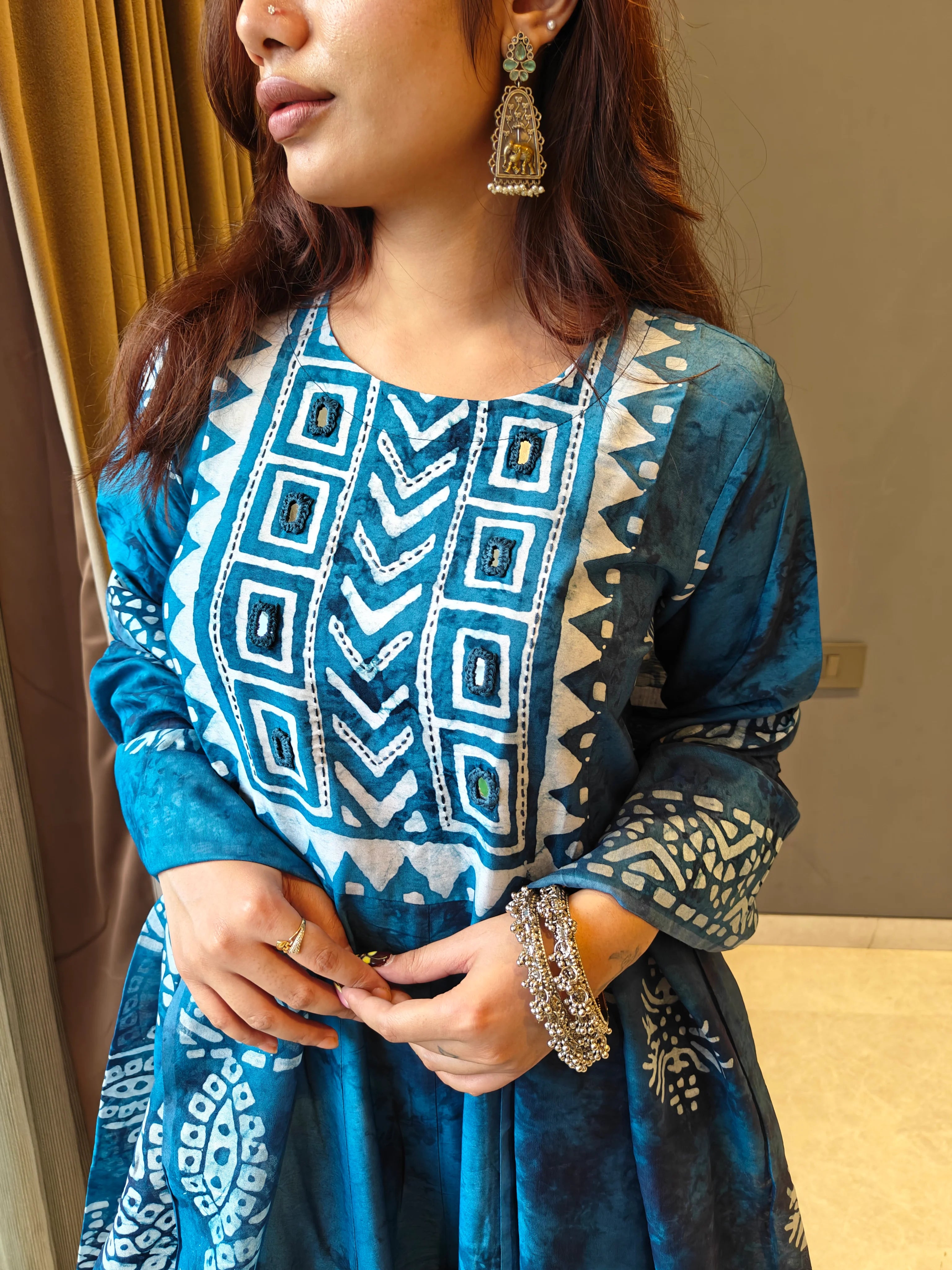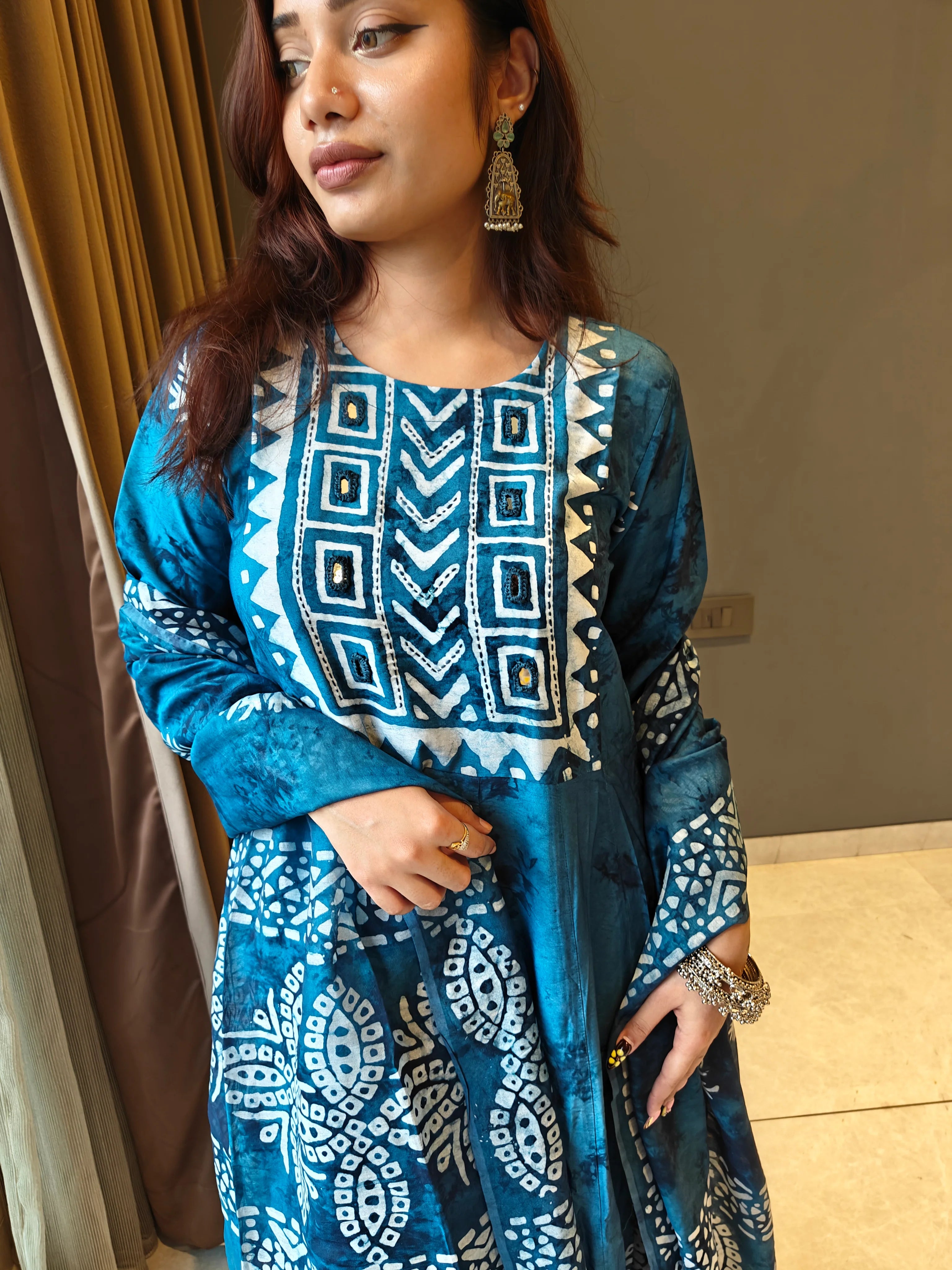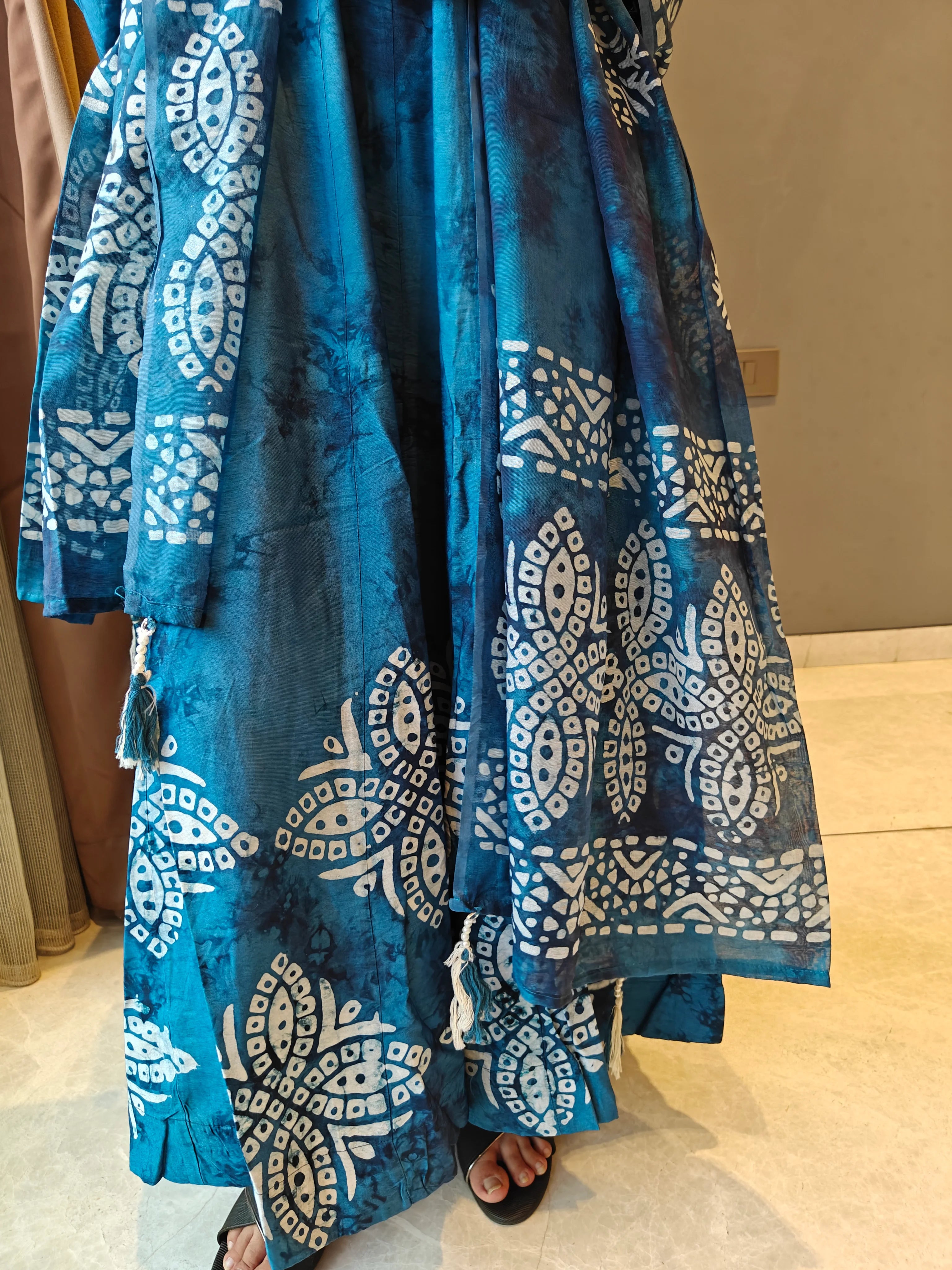 Stand out in style with this teal blue cotton kurta set with dupatta. Designed with Bandhej-inspired MOTI WORK and embroidered yoke, this straight kurta is paired with matching cotton pants and a printed dupatta. Lightweight and breathable, this 3-piece pure cotton suit set is perfect for Navratri office wear and festive days when you want comfort with elegance.